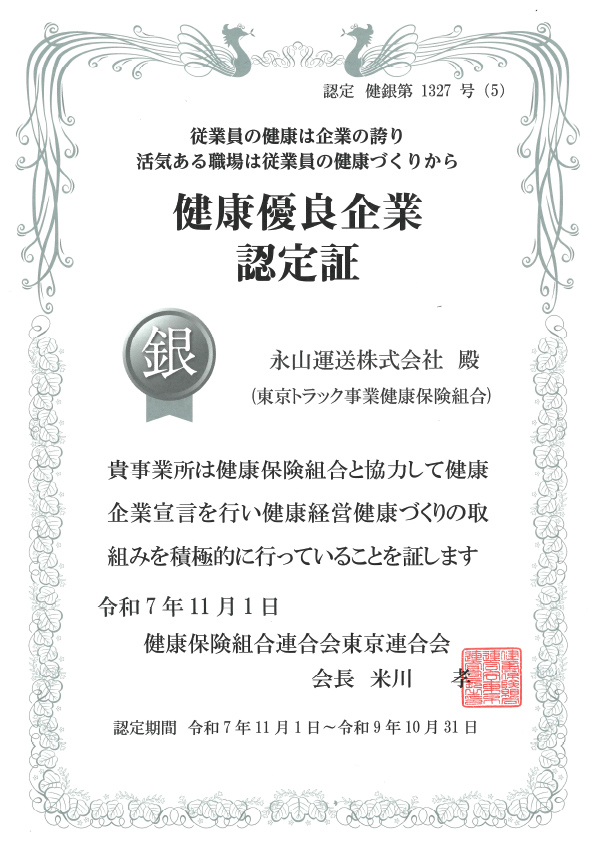 令和7年11月1日付で、「健康優良企業(銀の認定証)」を5年連続で更新しました(健銀第1327号(5))。