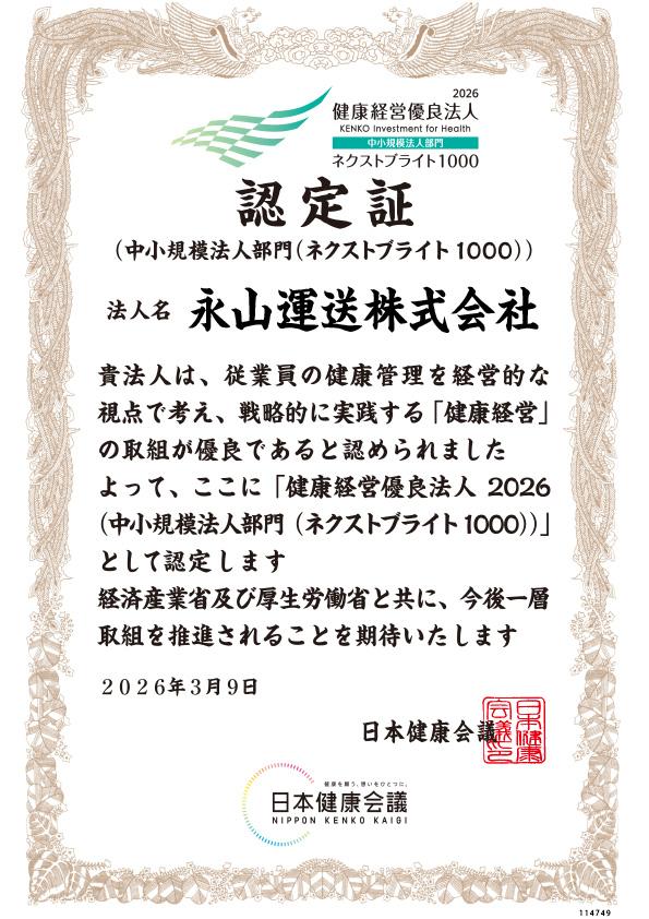 当社は、経済産業省が推奨する「健康経営優良法人認定制度」により、中小規模法人部門における健康経営優良法人2026「ネクストブライト1000」に、認定されました。